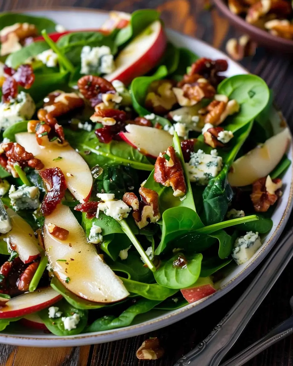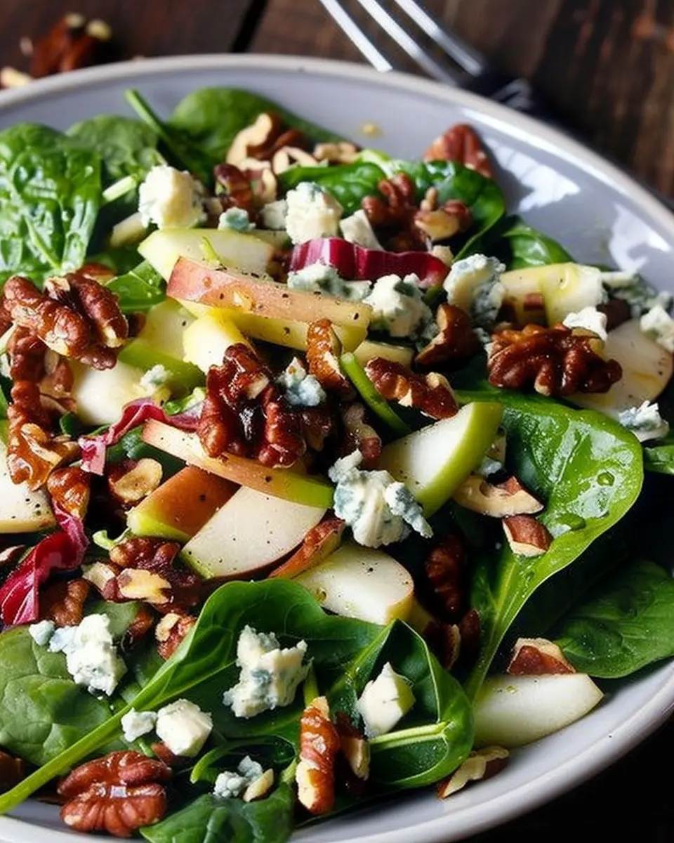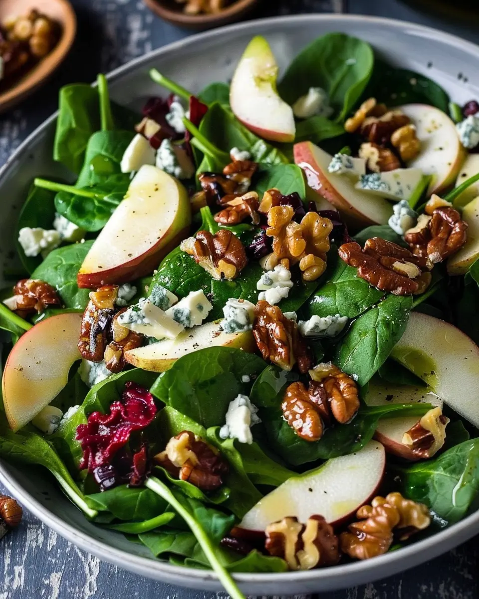 A refreshing winter salad featuring the perfect combination of spinach, sweet apples, creamy gorgonzola, and crunchy candied walnuts. This dish is not only delicious but also easy to prepare, making it a great addition to your winter meals.