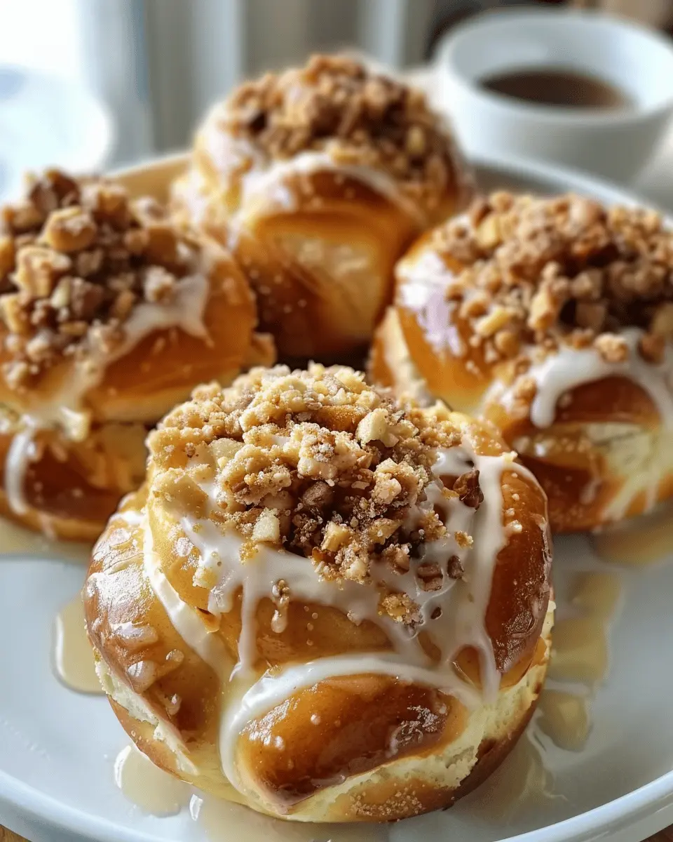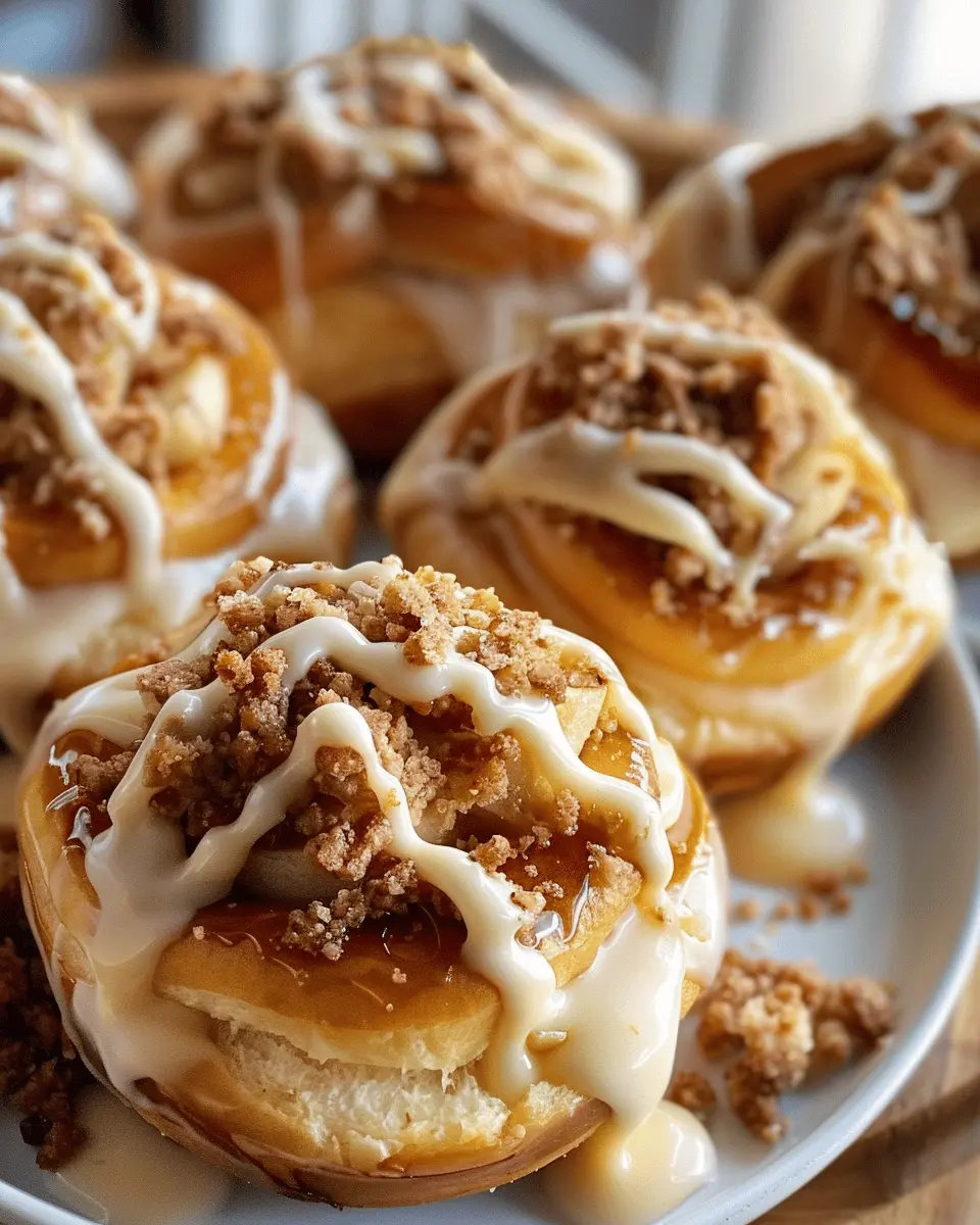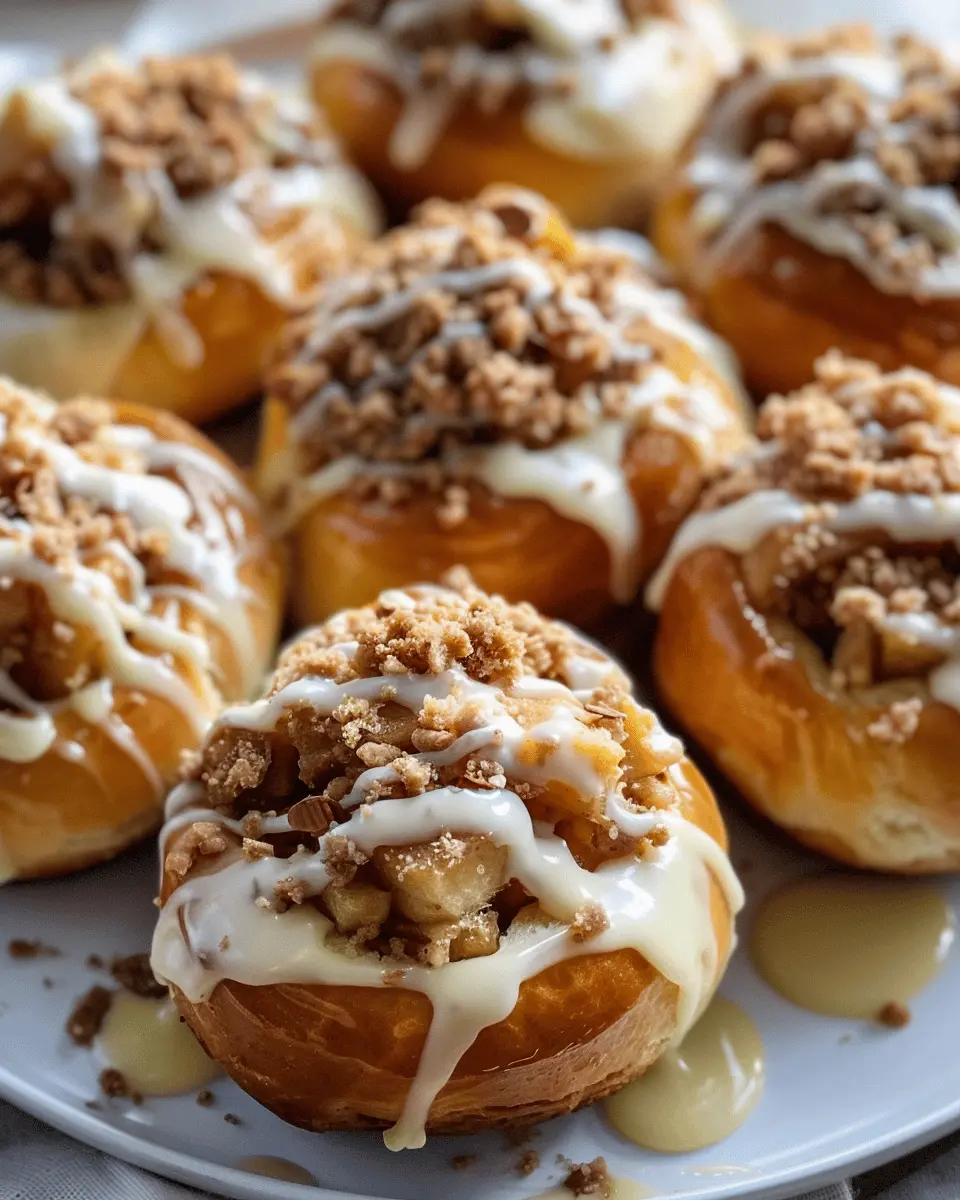 Keywords: Apple Cheesecake Buns, Crumble Topping, Sweet Glaze