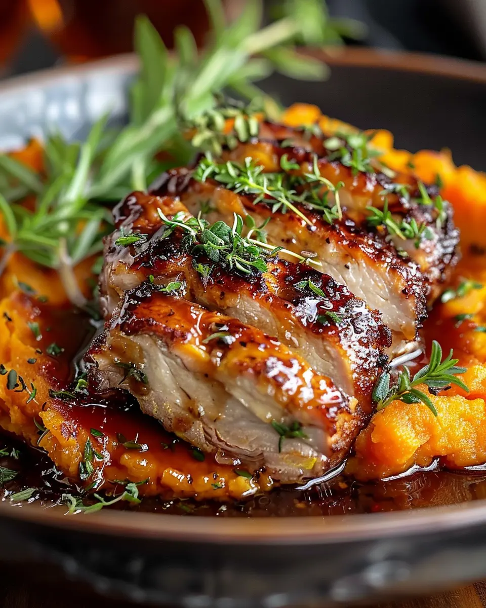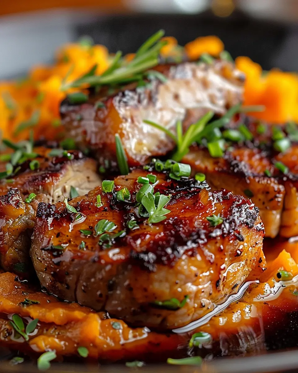 - Once the pork is done, let it rest for a few minutes before slicing. Serve with the mashed sweet potatoes on the side.