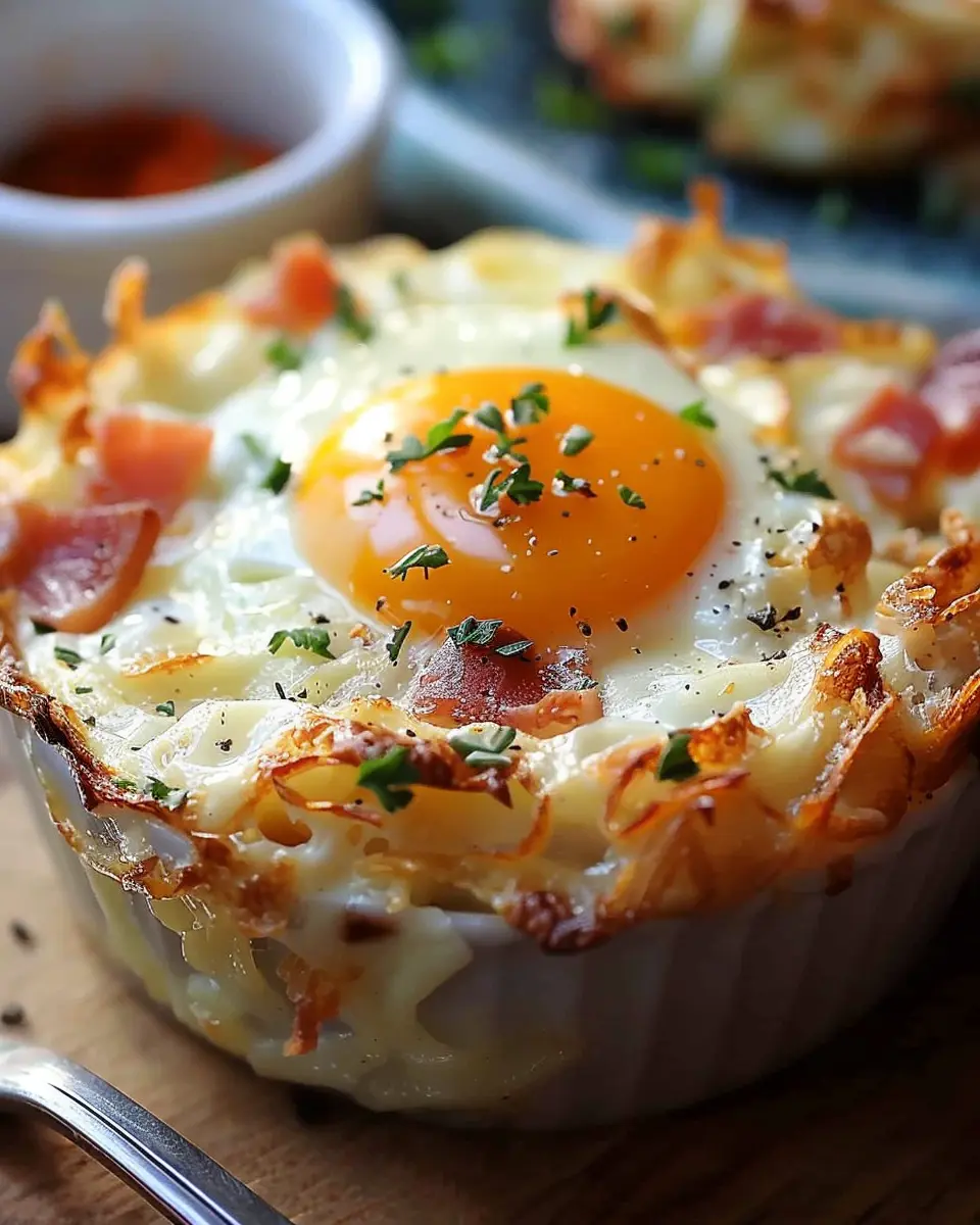 A delicious and easy recipe for baked eggs topped with turkey bacon, perfect for a hearty breakfast or brunch.