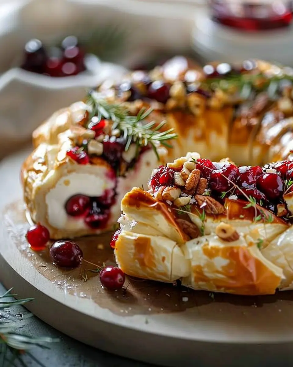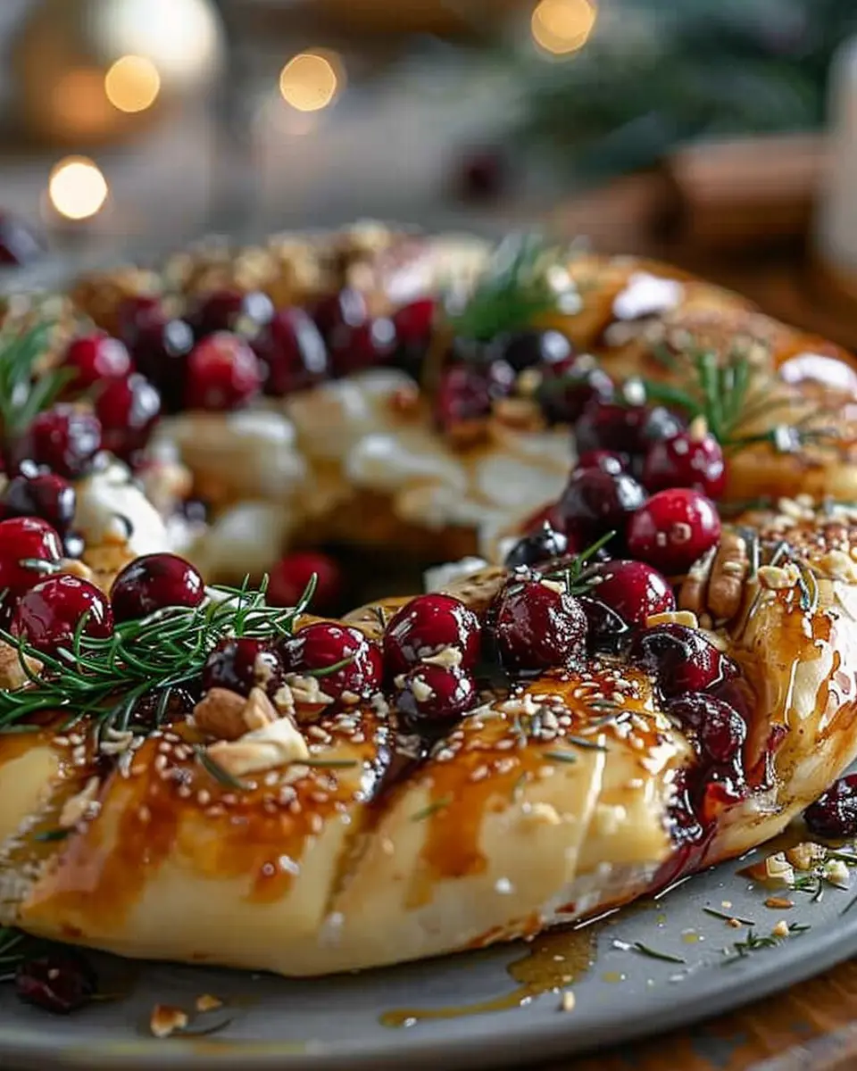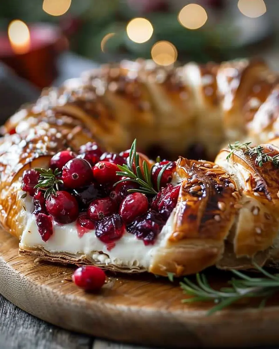 Visual Appeal: First impressions are everything, especially when it comes to holiday gatherings. The circular shape resembling a wreath, adorned with vibrant colors from the cranberry sauce and garnished with fresh herbs, makes this appetizer a centerpiece that sparks conversation.