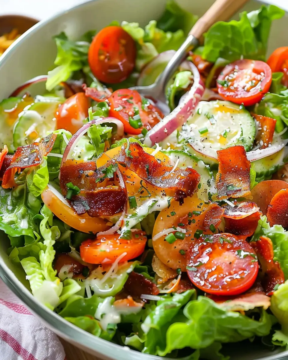 With your ingredients prepped, it’s time to bring them all together. In a large bowl, gently combine the lettuce, tomatoes, cucumber, carrots, and red onion. If you’re adding turkey bacon and chicken ham, toss those in now too. The idea is to mix well while keeping the integrity of each ingredient intact.