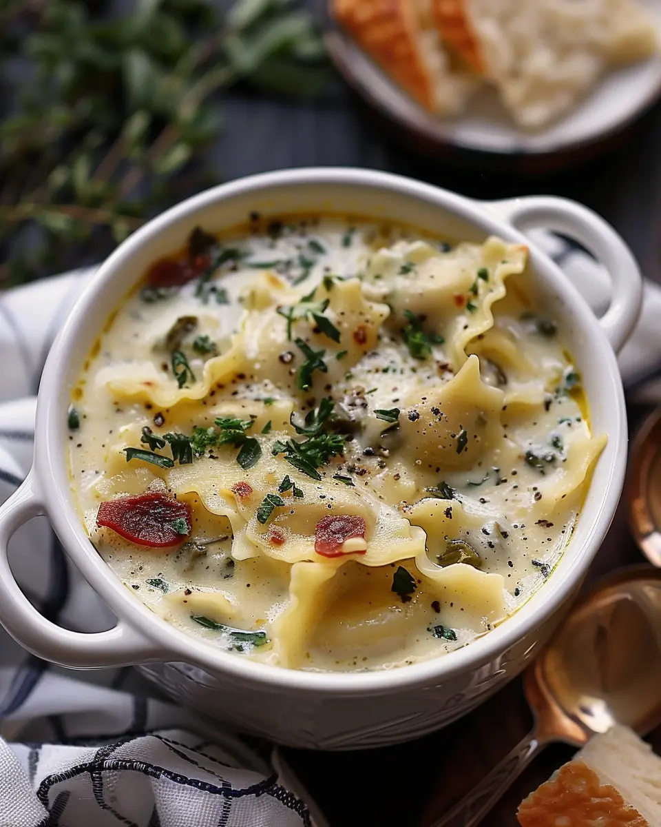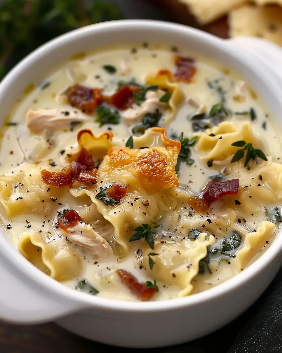 A delightful and creamy soup that combines the flavors of lasagna with tender chicken, offering a comforting meal perfect for any occasion.