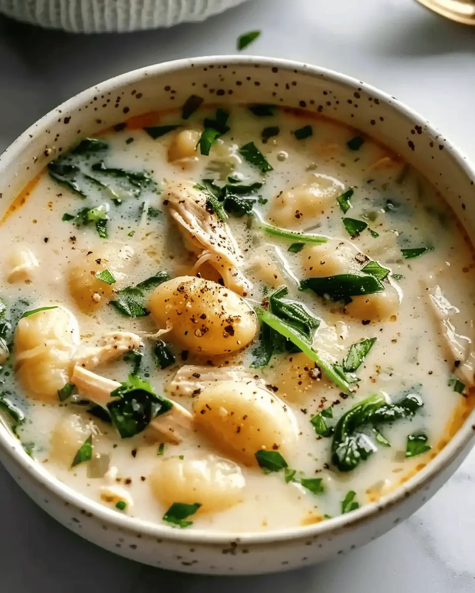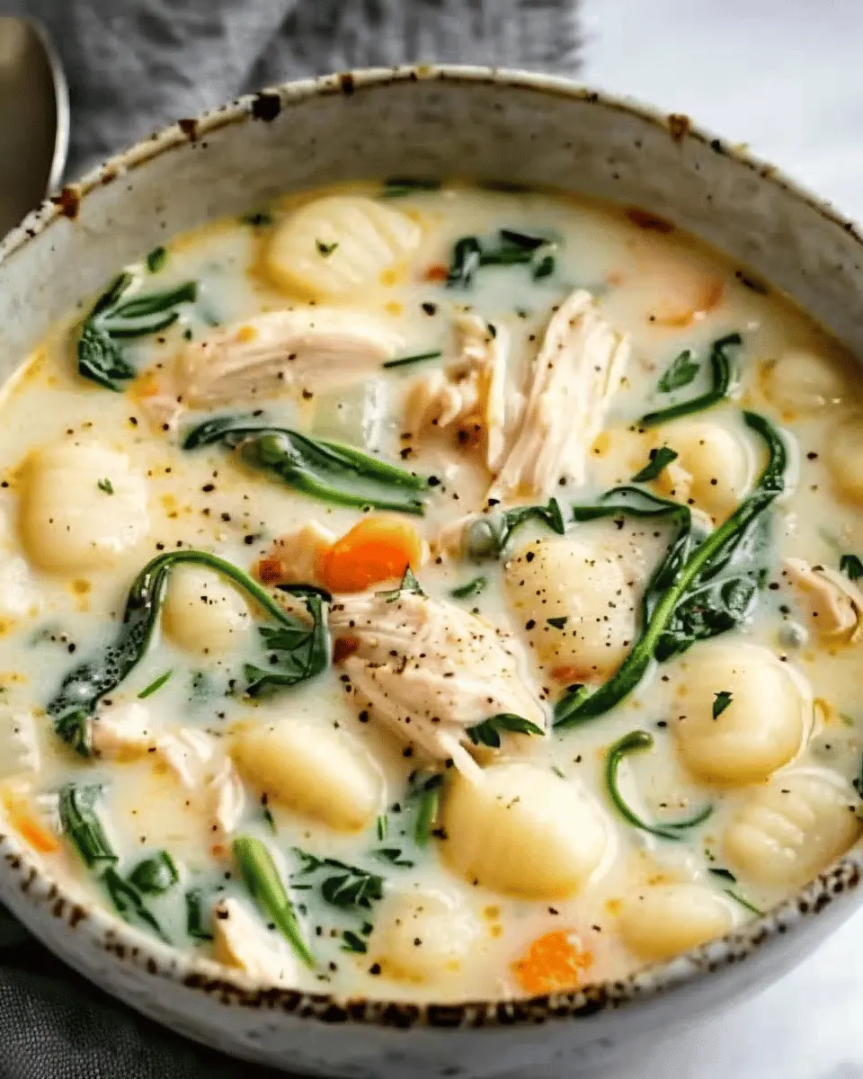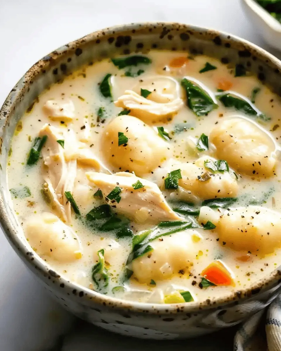 A comforting and creamy soup made with tender chicken and gnocchi, perfect for chilly days.