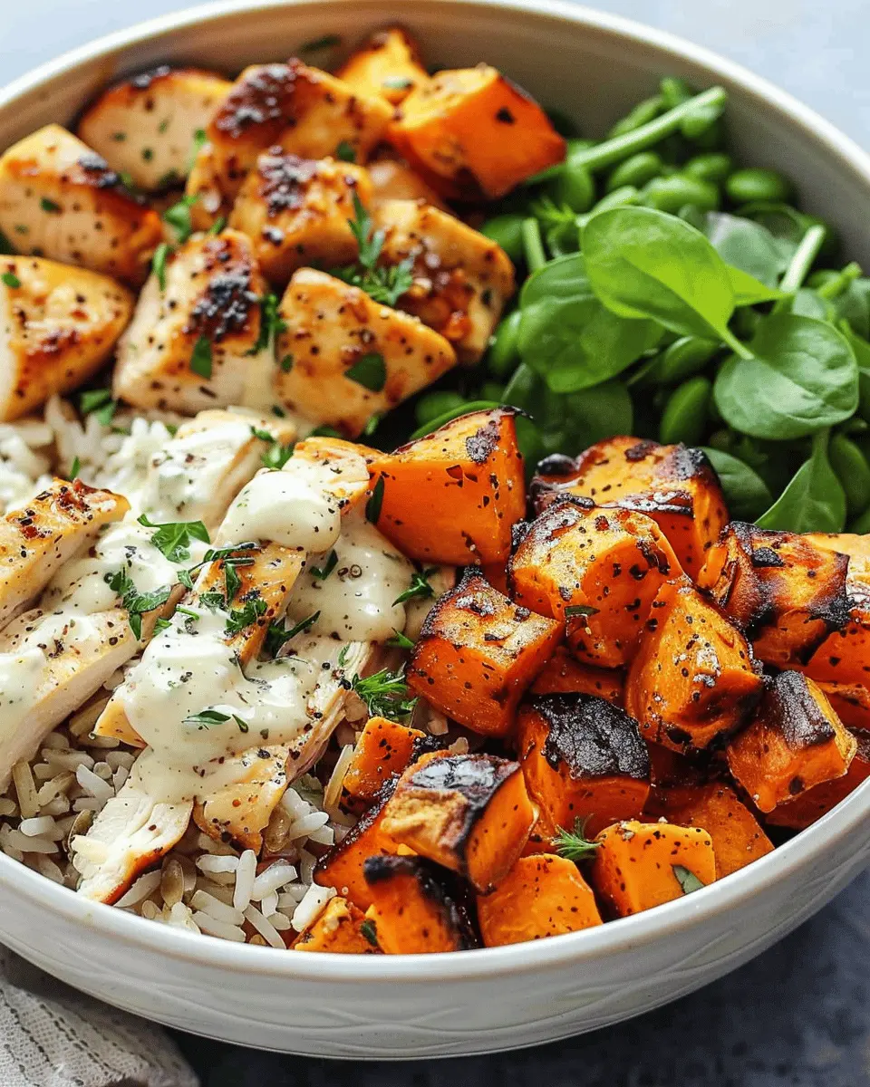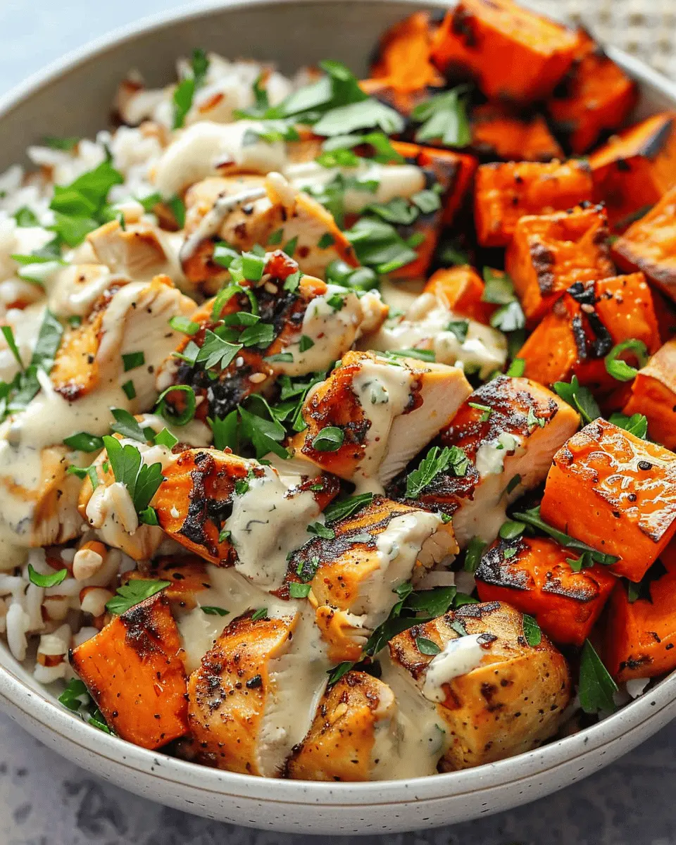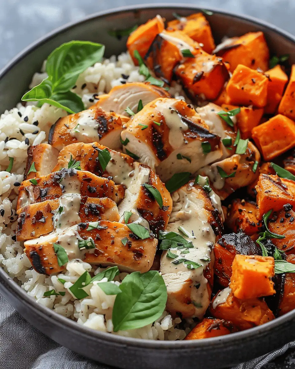The beauty of this bowl lies in its beautiful balance of flavors and nutrients. With protein-packed chicken, filling sweet potatoes, and perfectly cooked rice, it’s a complete meal that covers all your dietary bases. You can customize it further with seasonal vegetables or herbs, making it a versatile option for any weeknight dinner.