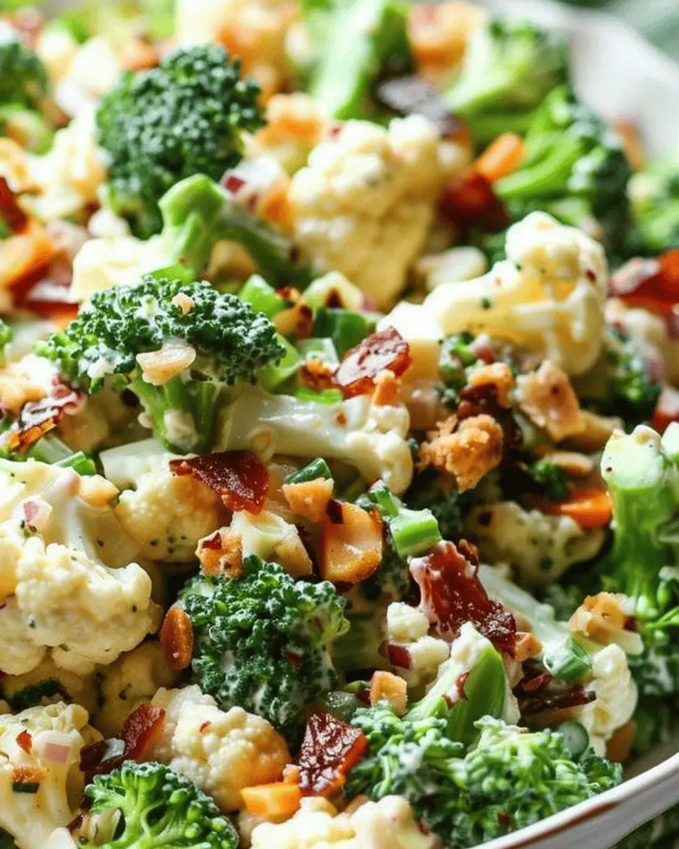 PrintLoaded Broccoli Cauliflower Salad: A Flavorful Low Carb Delight