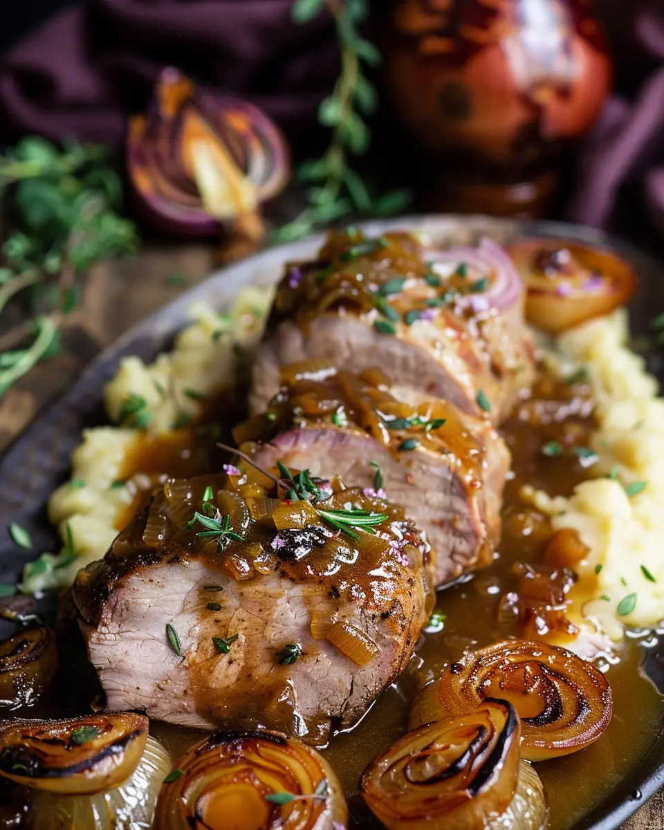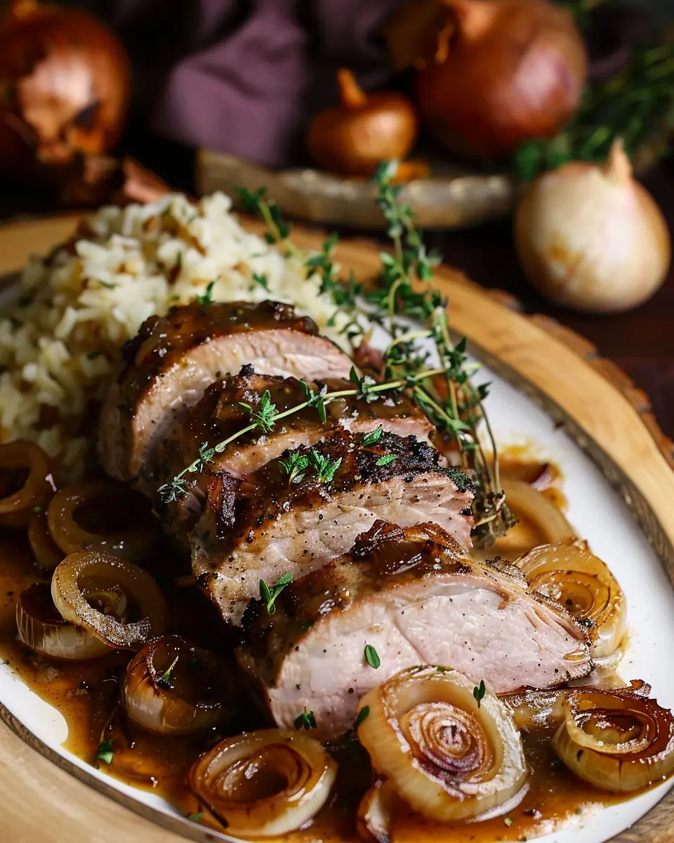 - Let the pork rest for 5 minutes, then slice and serve with caramelized onions.