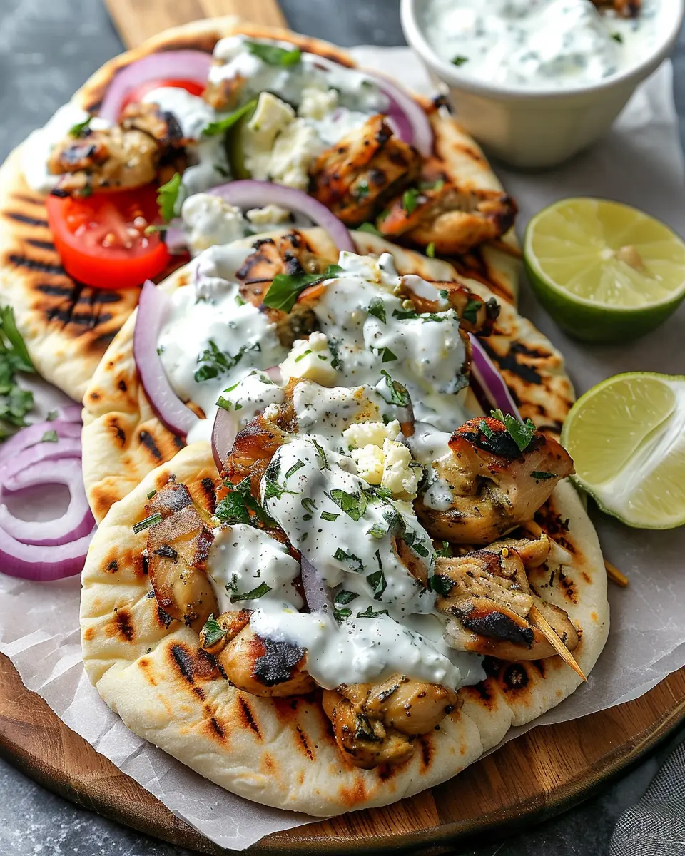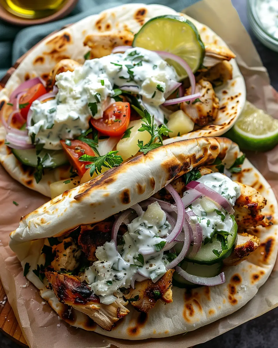 Now for the fun part—assembling your gyros! Take a warmed pita, add a generous portion of grilled chicken, and top it with your creamy feta tzatziki.