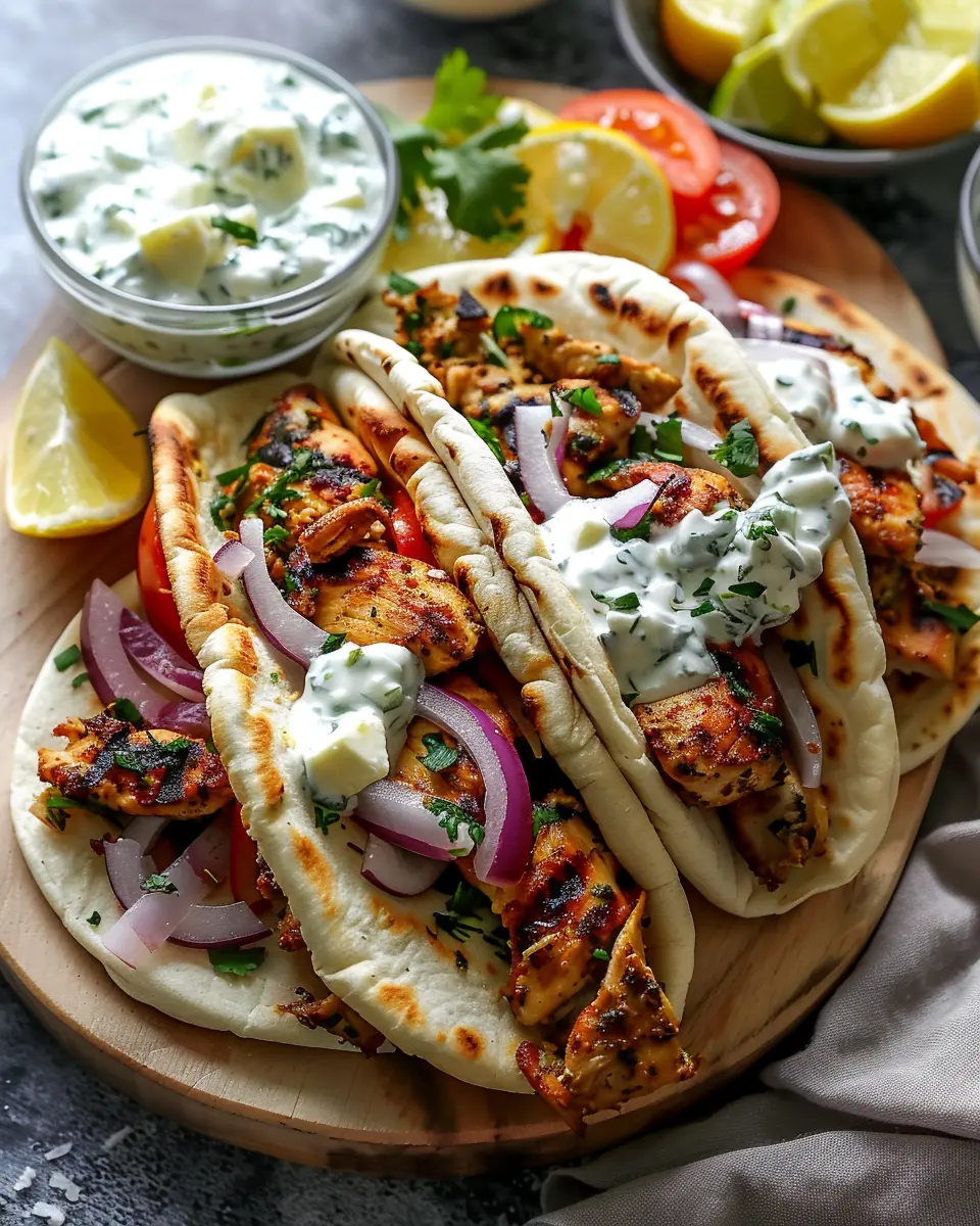 Delicious Mediterranean Chicken Gyros served with a creamy feta tzatziki sauce that enhances the flavor.