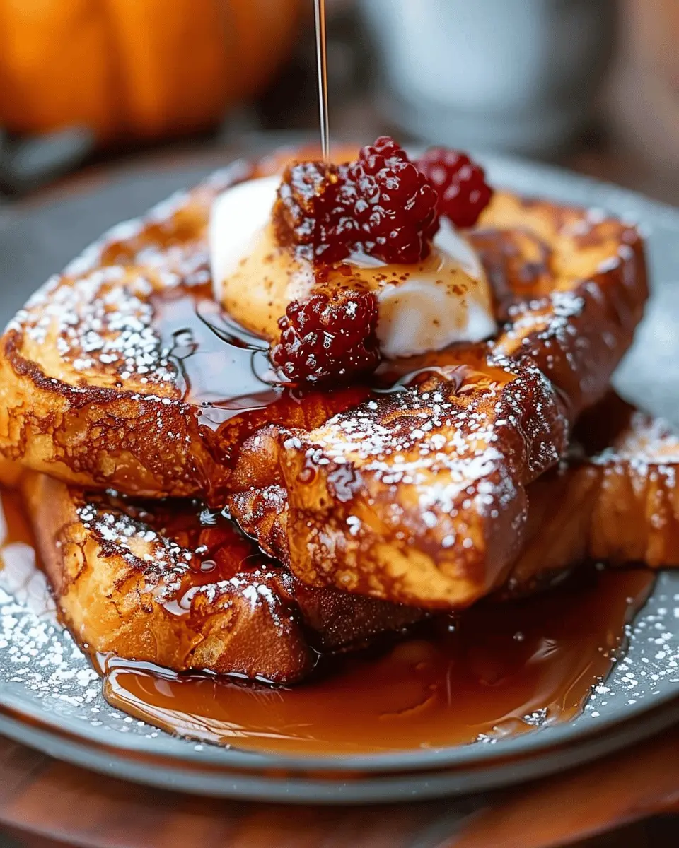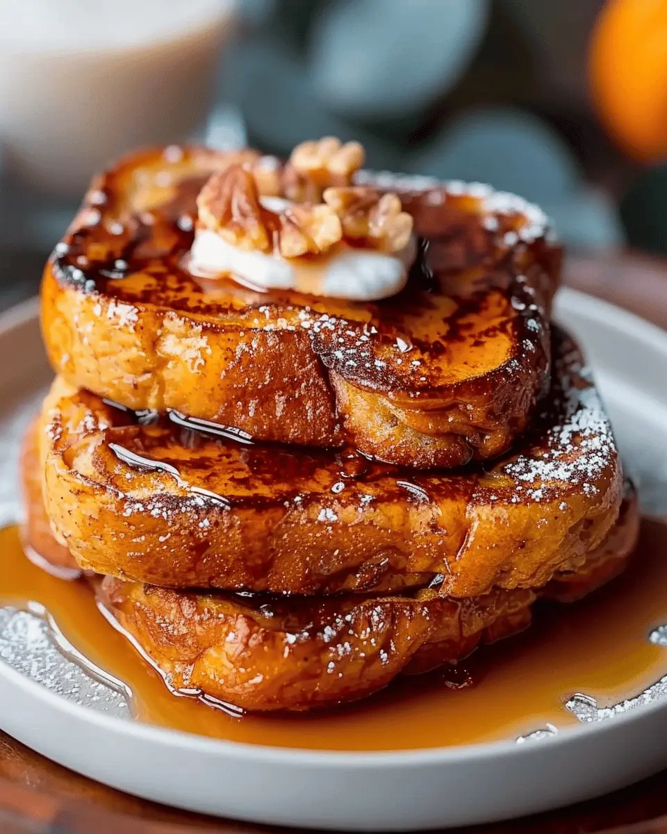 Once your Pumpkin French Toast Breakfast is ready, it’s time to serve! Stack the slices on a plate, drizzle with maple syrup, and sprinkle some powdered sugar for that extra touch. If you want to elevate your breakfast further, garnish with some pumpkin seeds or chopped nuts for a delightful crunch.
