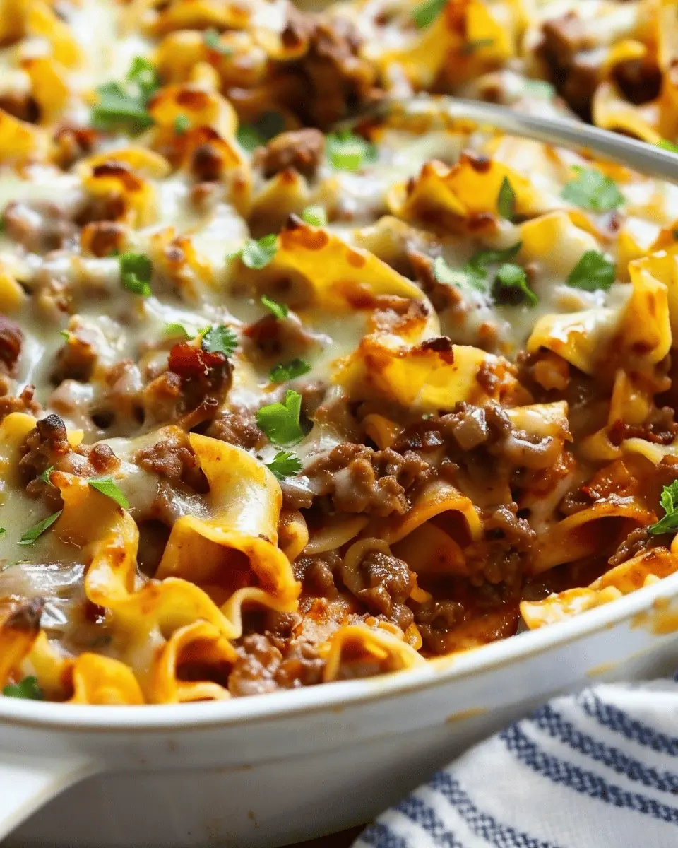 Assembling your casserole is where the magic truly happens. In a large baking dish, start by layering half of the cooked egg noodles, followed by the beef mixture. Next, spread half of the creamy cheese filling on top, and then repeat with the remaining noodles and beef mixture. Finally, dollop the rest of the cheese filling on top, ensuring a generous spread.