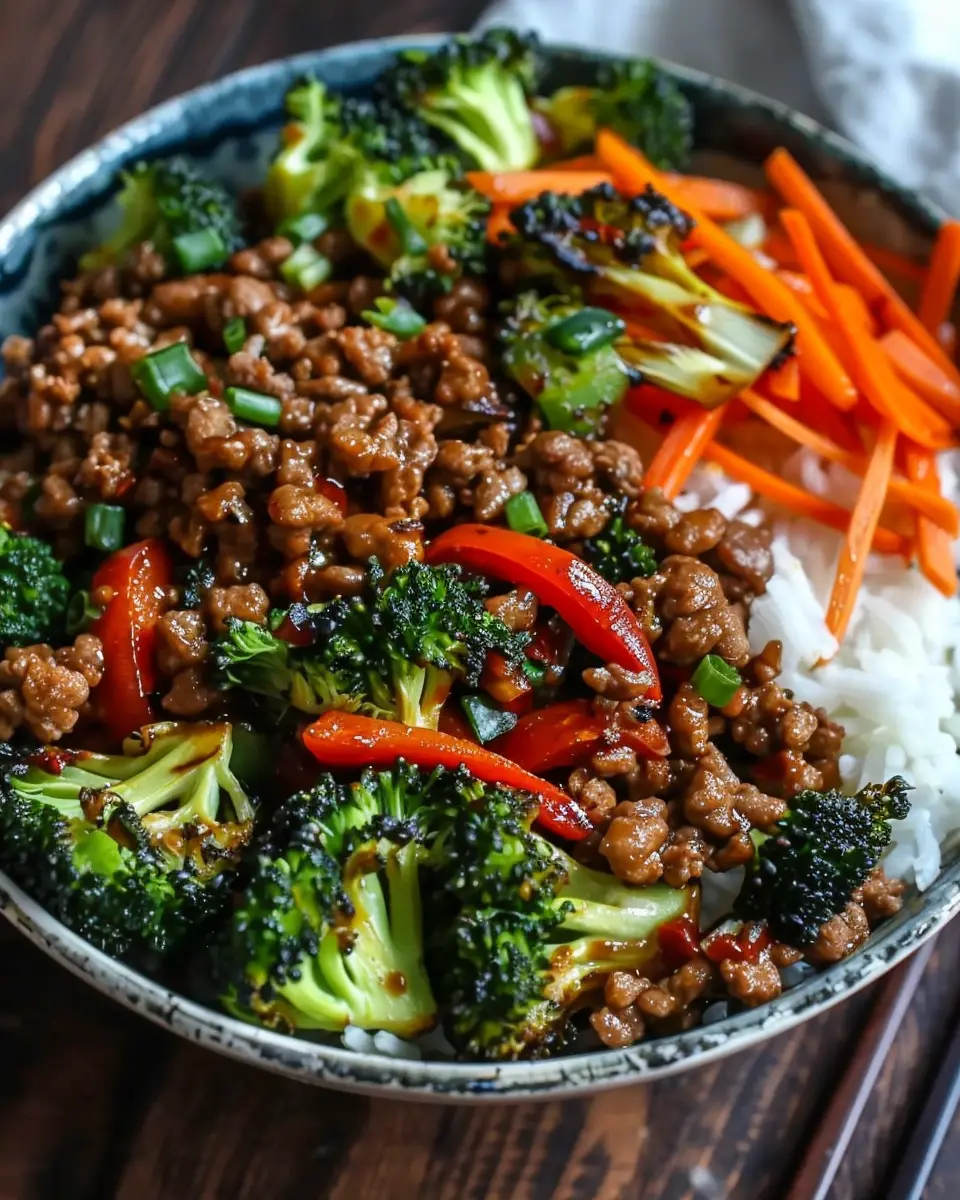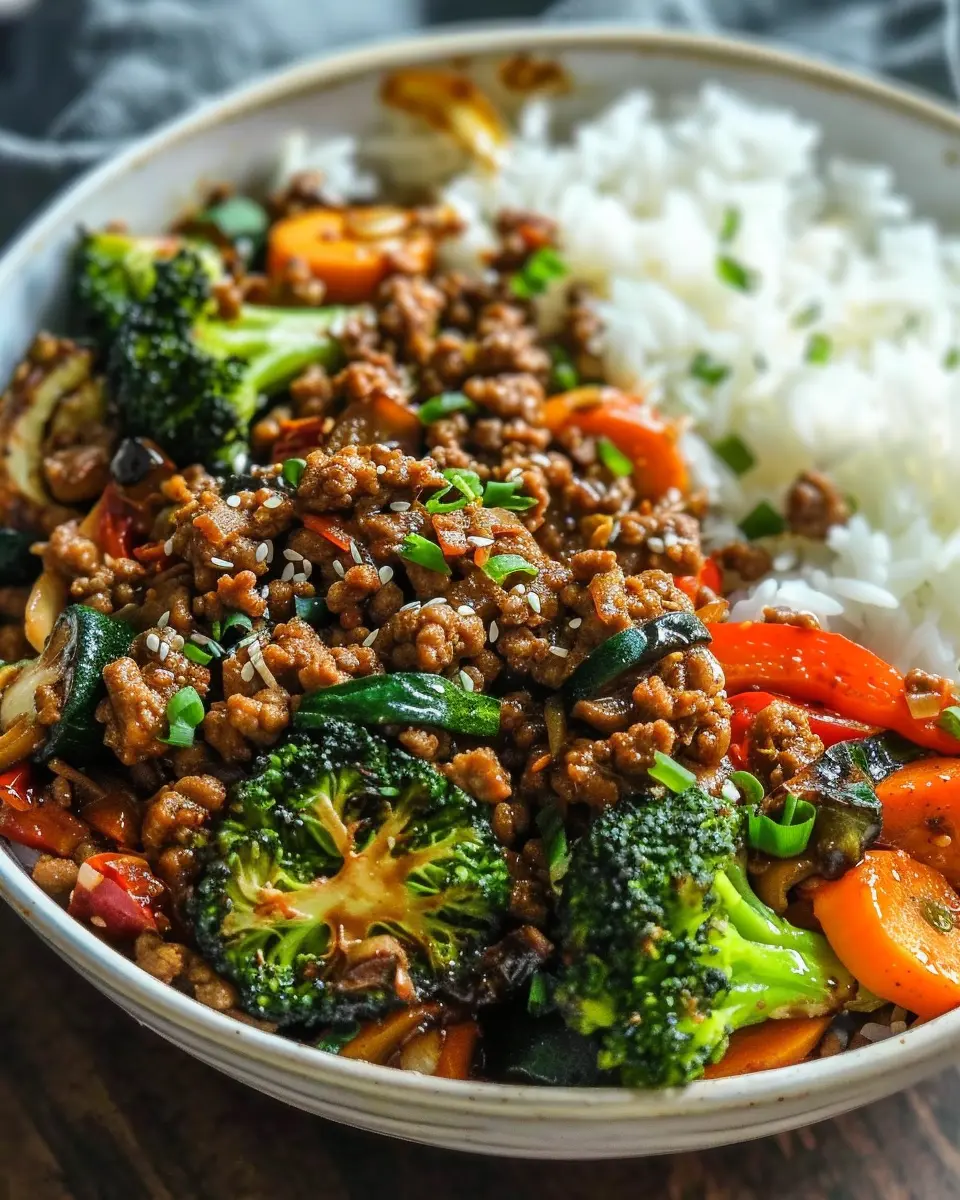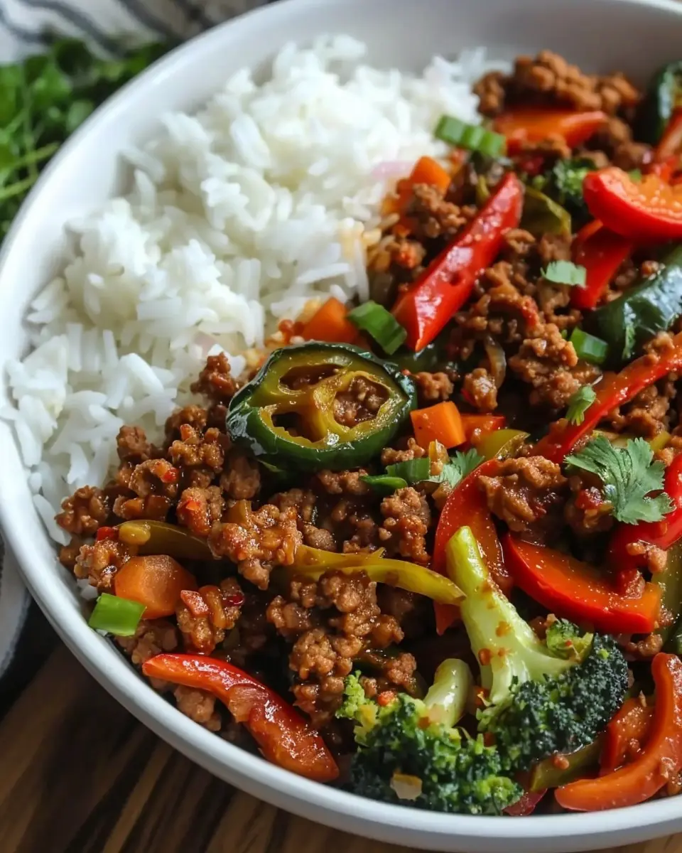 Keywords: Spicy Ground Beef, Stir-Fry, Garlic Veggies, Rice Bowl